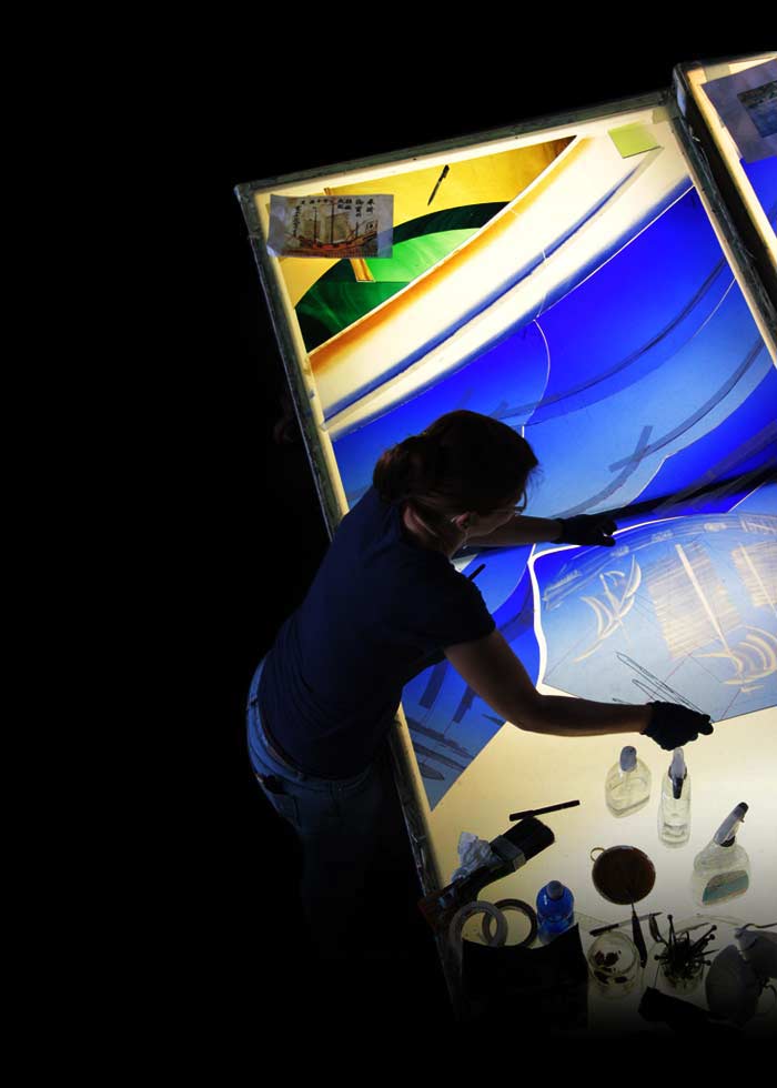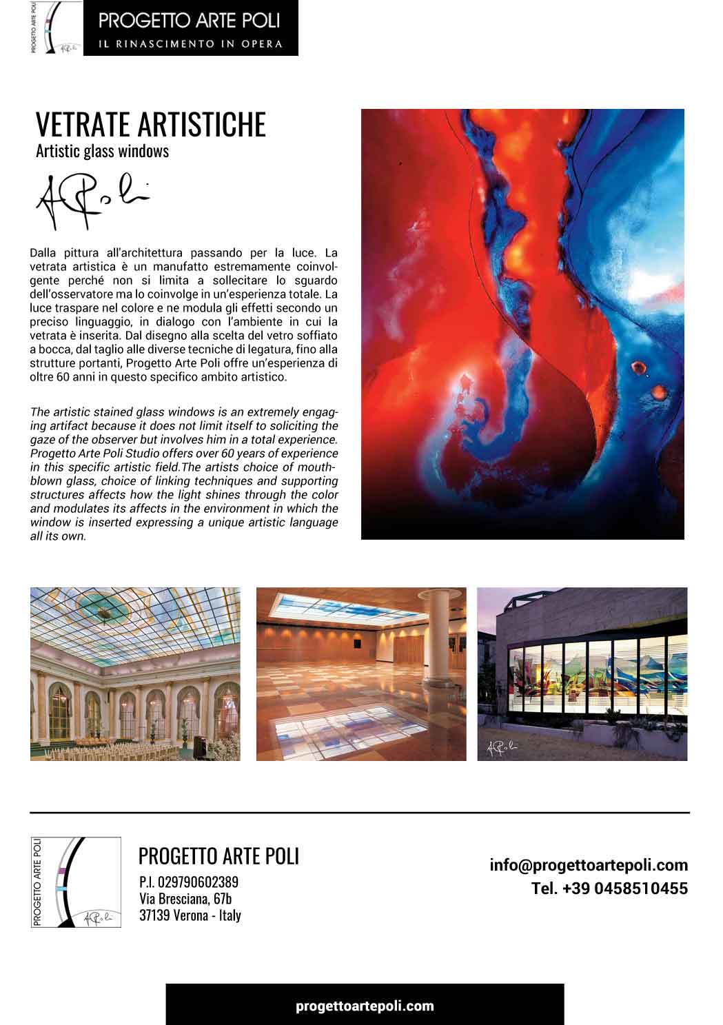 STAINED GLASS: A PAINTING THROUGH THE ARCHITECTURE OF LIGHT. The artistic stained glass windows is an extremely engaging artifact because it does not limit itself to soliciting the gaze of the observer but involves him in a total experience. Progetto Arte Poli Studio offers over 60 years of experience in this specific artistic field.The artists choice of mouth-blown glass, choice of linking techniques and supporting structures affects how the light shines through the color and modulates its affects in the environment in which the window is inserted expressing a unique artistic language all its own.