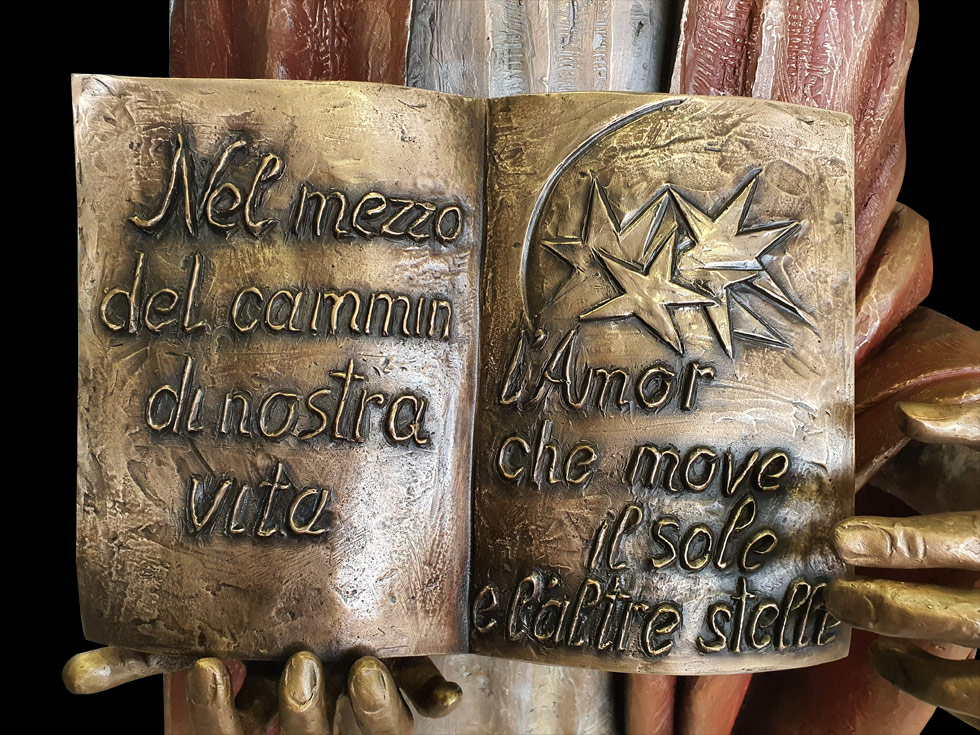 Volto che rivela concentrazione e tenacia, lineamenti pronunciati, naso aquilino, mento leggermente sporgente. L’abbigliamento è quello dell’epoca: veste, mantello, calzari di cuoio, copricapo con stringhe lunghe fino al collo e corona d’alloro. La nuova statua di Dante è realizzata secondo l’iconografia che la storia dell’arte ci ha consegnato da Giotto, suo contemporaneo, in poi.