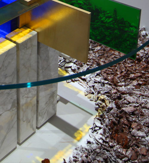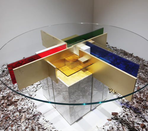 Il corpo del tavolo è solido pur essendo composto da più di un elemento e il disco di vetro che copre la composizione riflette nell'ambiente i suoi colori.
