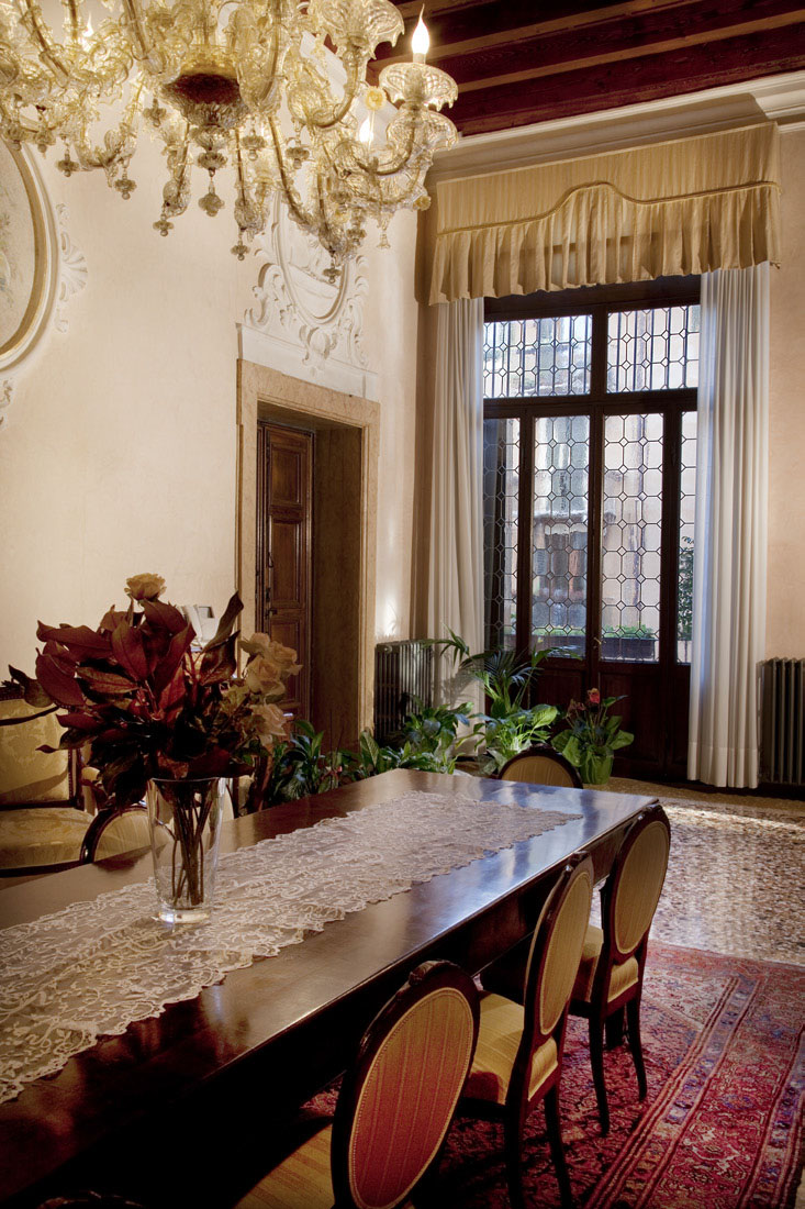 Nel Palazzo sono state realizzate le vetrate in vetro soffiato nello stile classico con disegno geometrico e legatura a piombo, il cancello e lampade in ferro battuto.